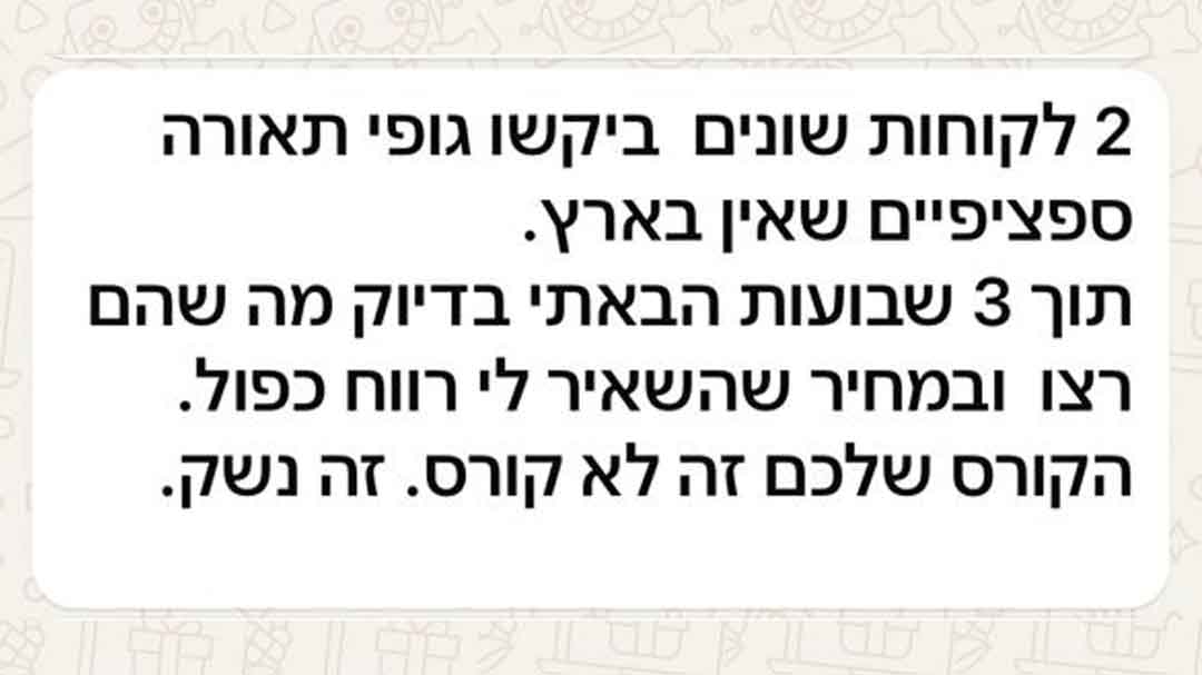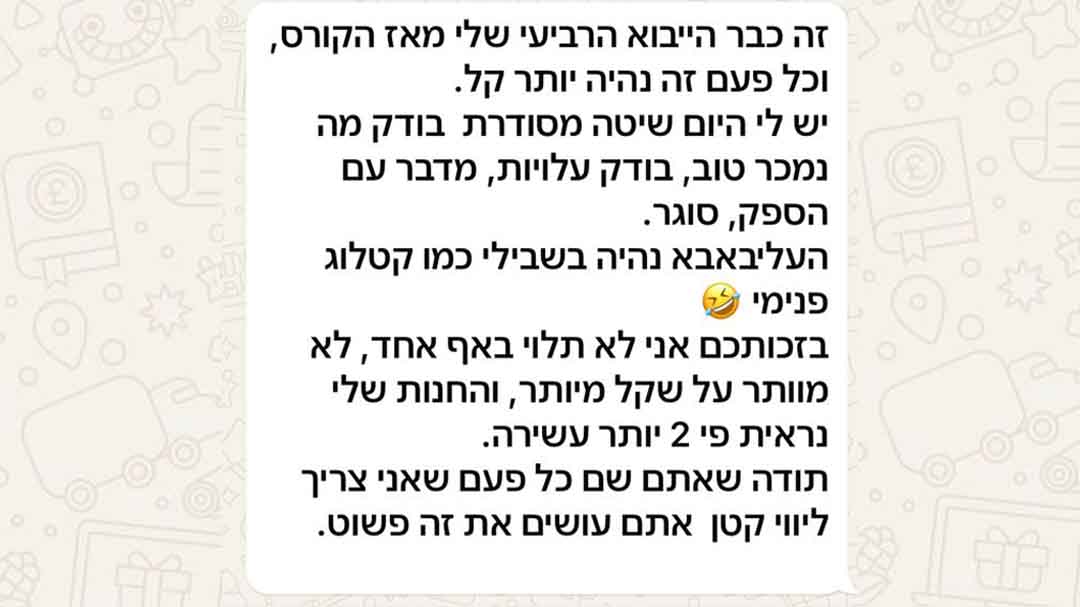 אחרי שתעשה הזמנה ראשונה ושניה עם השיטה, ההזמנות הבאות כבר יהיו פשוטות יותר כי יש לך תהליך ואתה יודע מה לעשות. בנוסף הקורס פתוח לשנה שלמה כדי שתוכל לחזור לתבניות לצ׳קליסטים ולשלבים מתי שתרצה.